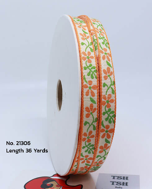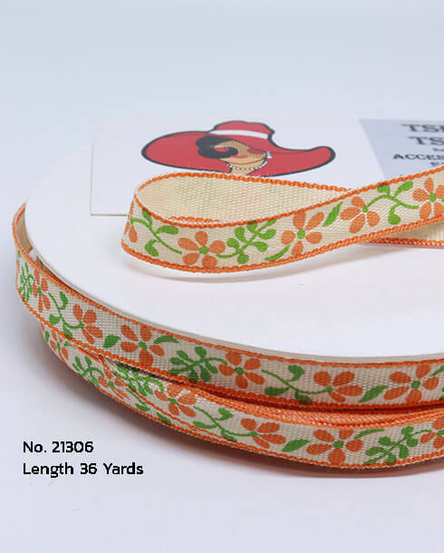 10 mm. Flower Printed Cotton Ribbon 36 Yard, Orange Color