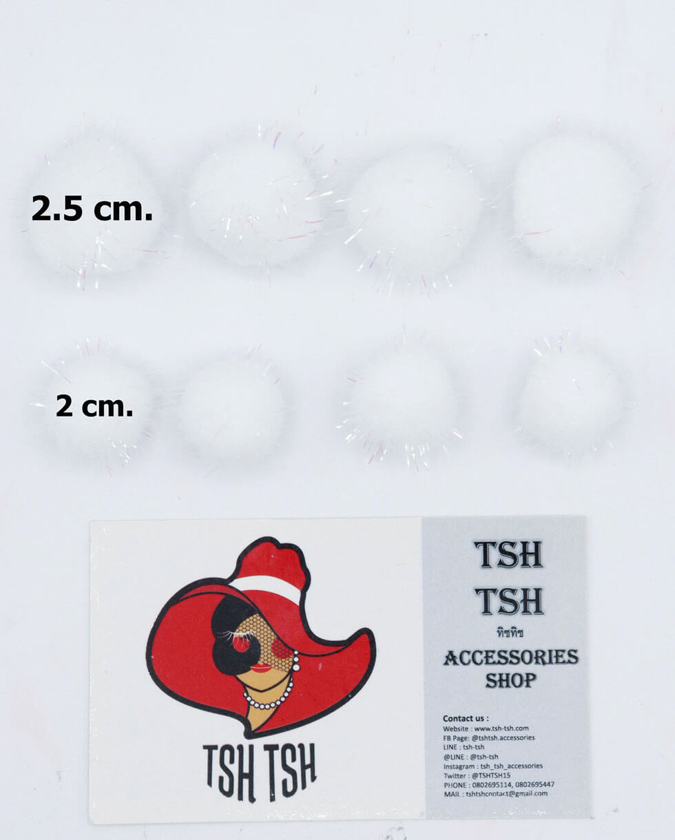 wish listปอม ปอม กำมะหยี่ ขนาด 2 ซม. สีขาวมีดิ้น ใช้สำหรับประดิษฐ์ ตกแต่ง อาทิเช่น ตกแต่งงานปาตี้ ประดิษฐ์ของเล่นแมว ของเล่นสัตว์เลี้ยง ทำเครื่องประดับ กำไร สร้อยคอ หรือของเล่นเสริมพัฒนาการสำหรับเด็กเป็นต้น มีจำหน่ายทั้งราคาปลีกและส่ง สามารถนำไปประสานร่วมกับอะไหล่อย่างอื่นได้ เช่นริบบิ้น เรซิ่น มุกครึ่งซีก และอีกมากมายหรือนำไปตกแต่งสร้างมูลค่าเพิ่ม
