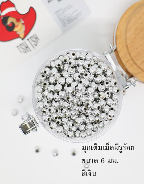 wish listมุกเต็มเม็ดทรงกลมมีรูร้อย ขนาด 6 มม. ขนาดรูร้อยประมาณ 1 มม. สีเงิน บรรจุ 100 กรัม ใช้สำหรับ ตกแต่งเสื้อผ้า ตกแต่งเล็บ ตกแต่งเครื่องประดับ คุณภาพดี มีจำหน่ายทั้งราคาปลีกและราคาส่ง