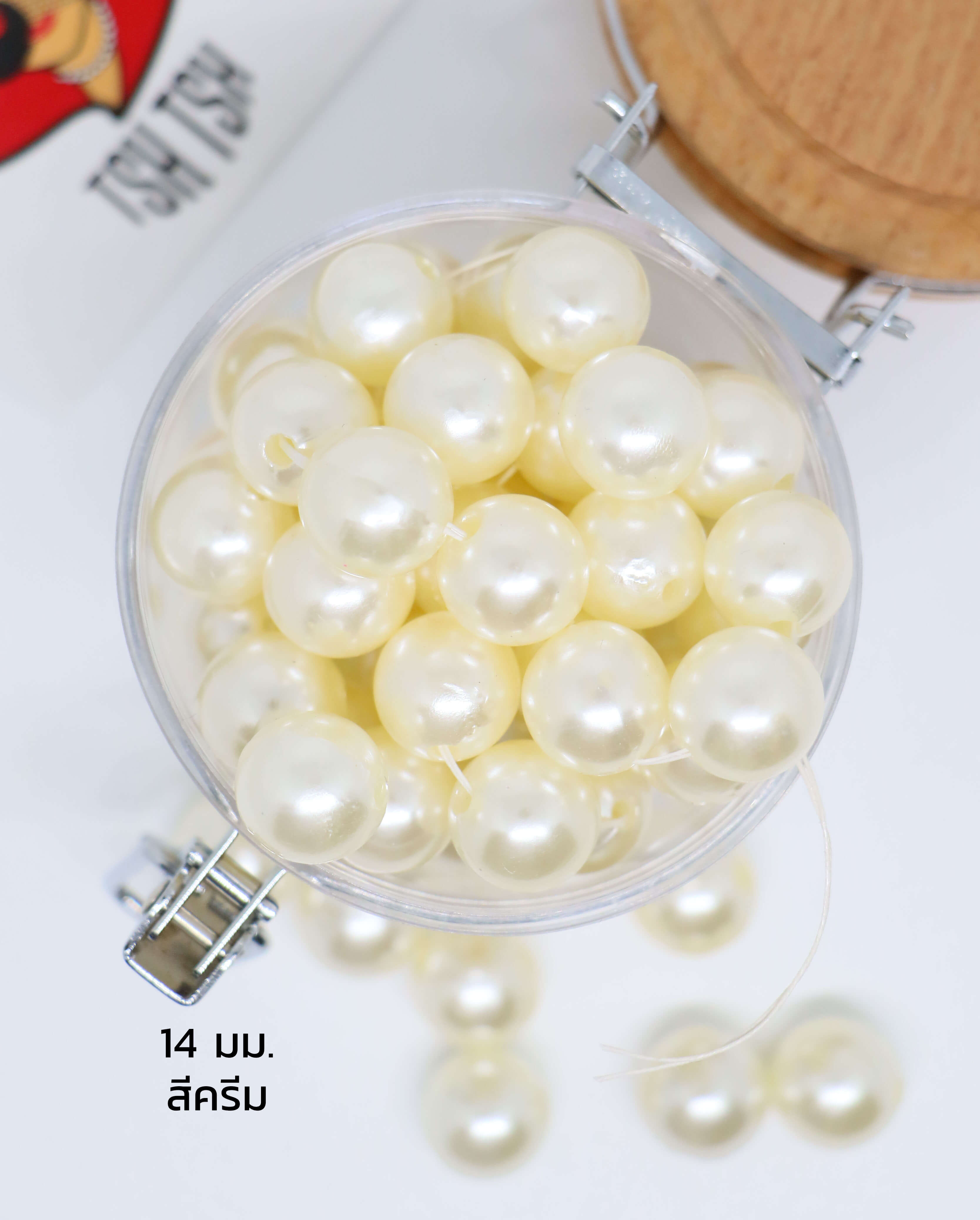 มุกเต็มเม็ดทรงกลมมีรูร้อย ขนาด 14 มม. สีครีม