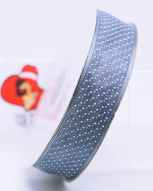 ริบบิ้นผ้าแก้ว ขนาด 1 นิ้ว สีเทาพิมพ์ลายจุดเล็กสีขาว ยาว 50 หลา #03