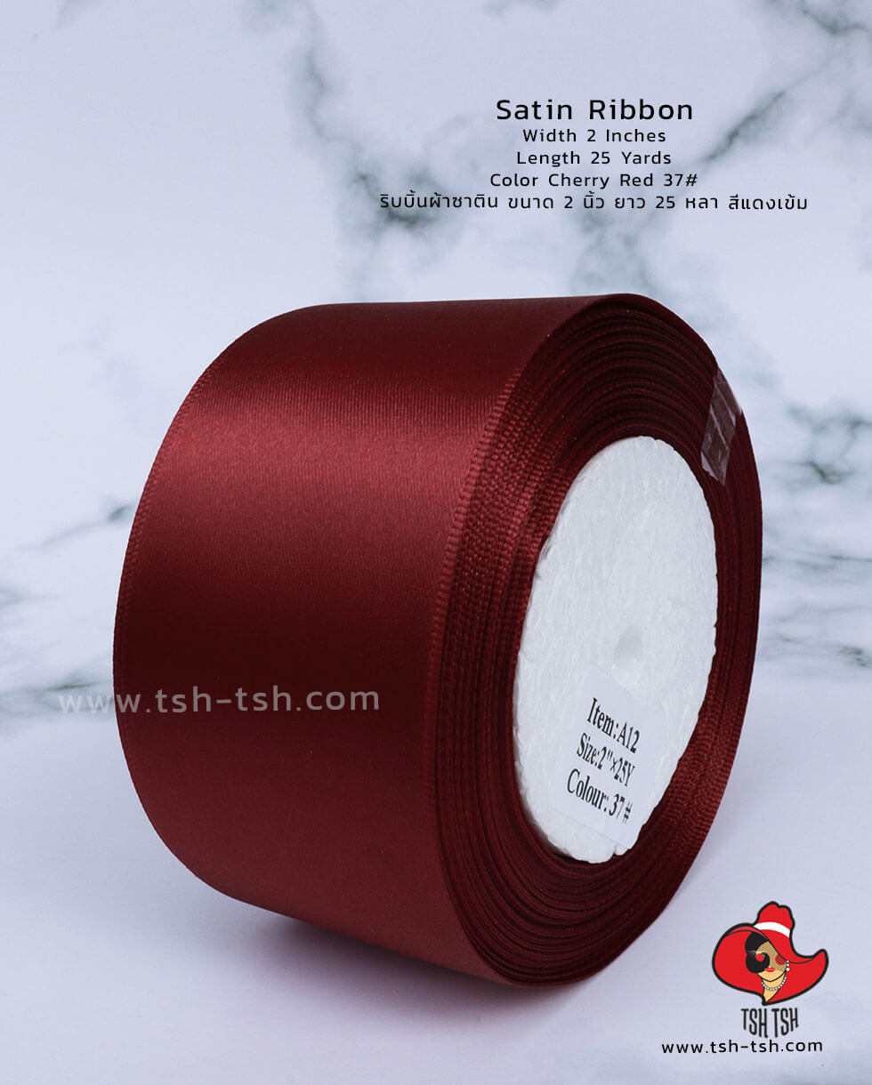 ริบบิ้นผ้าซาติน ขนาด 2 นิ้ว สีแดงเข้ม เงา 1 หน้า ยาว 25 หลา #37
