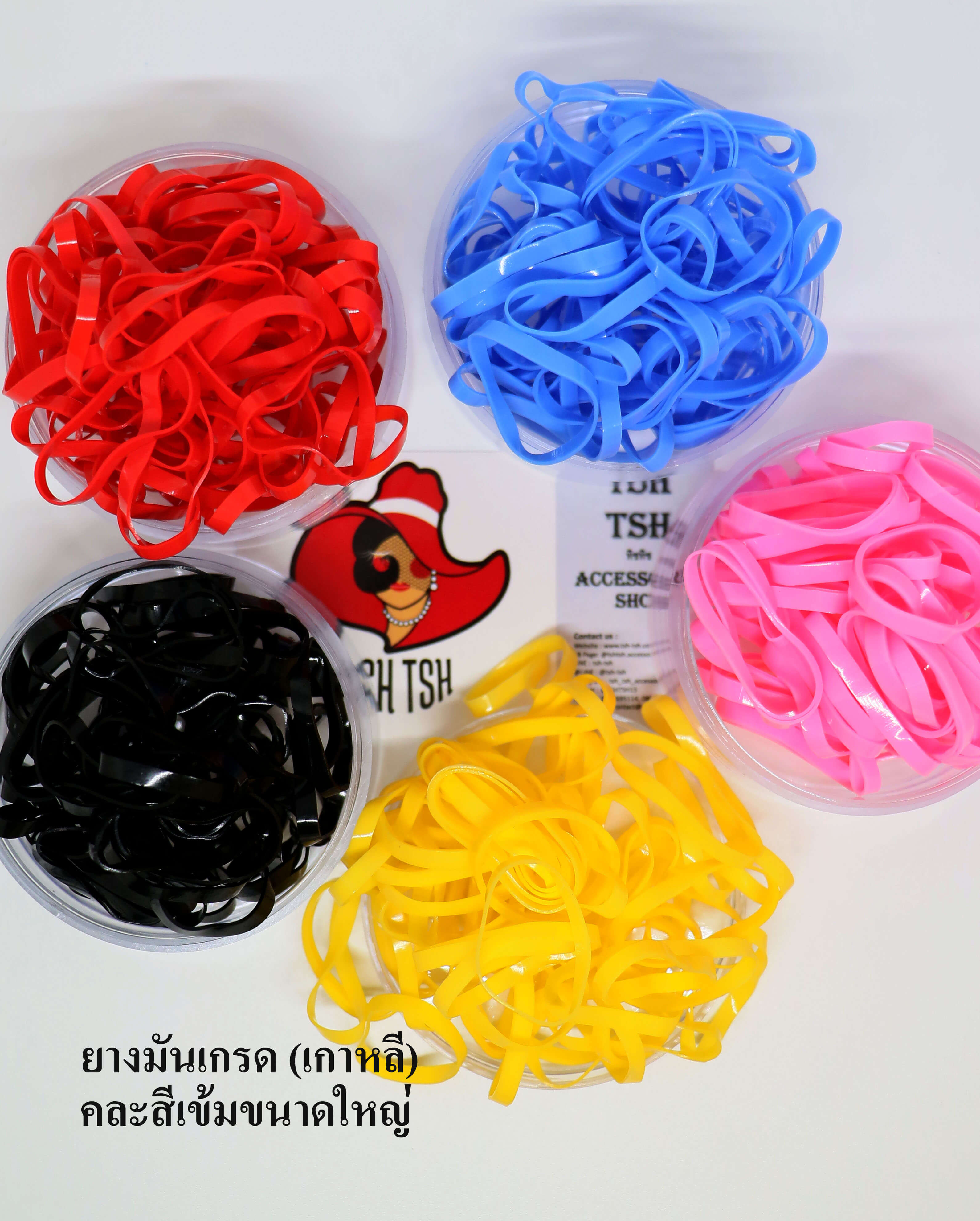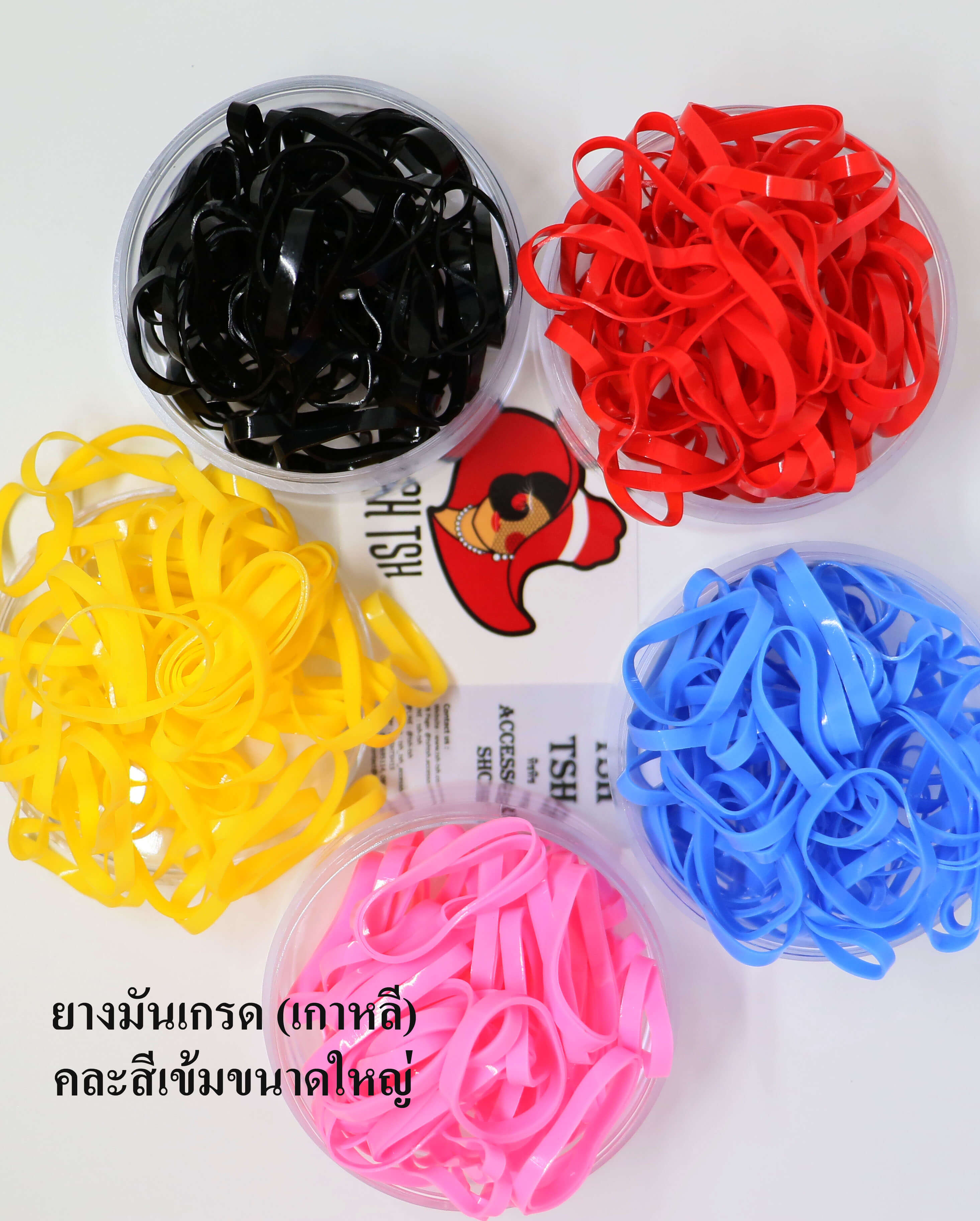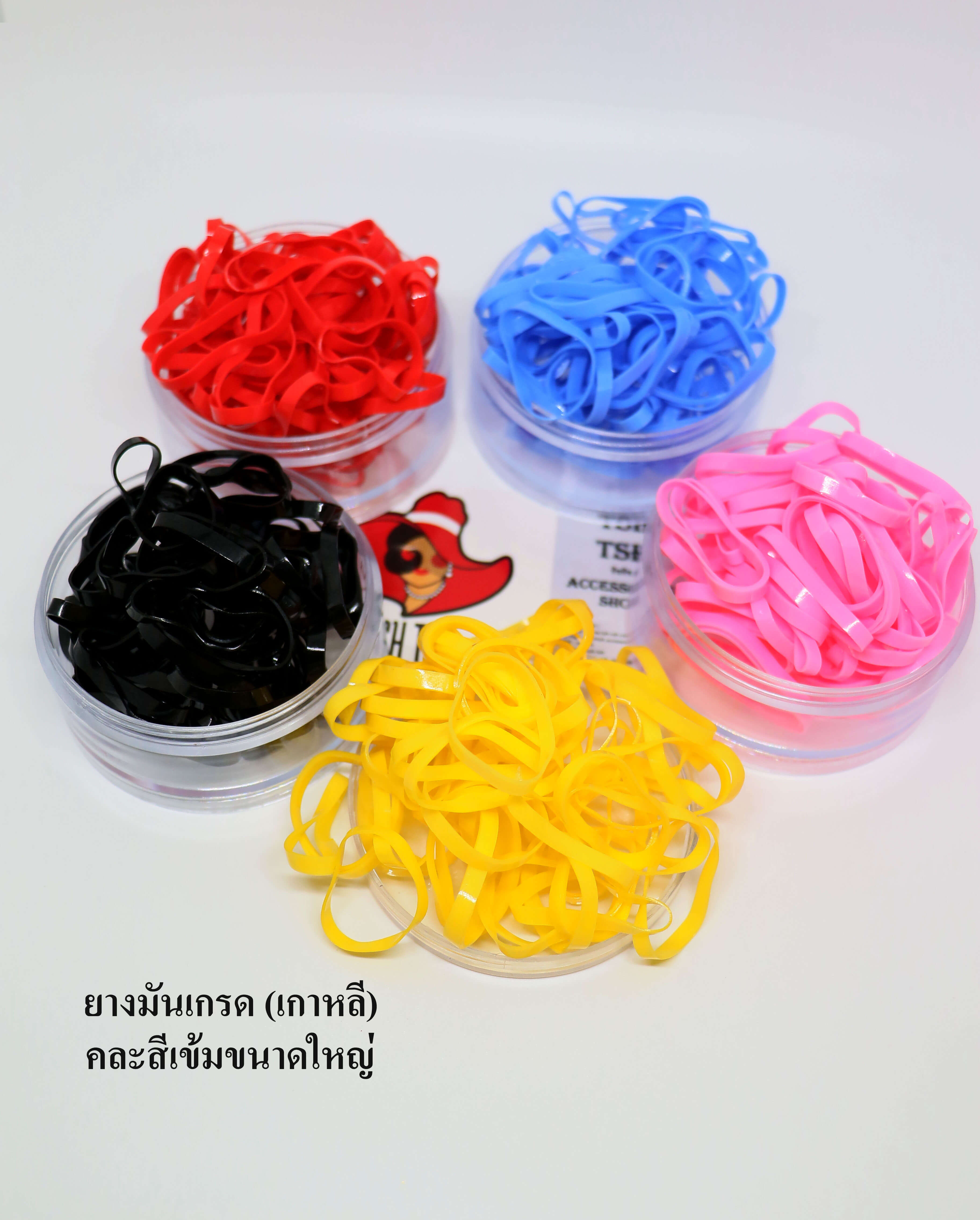 ยางมันคุณภาพดีเกรดพรีเมี่ยม (เกาหลี) สีเข้ม (คละ 5 สี ใน 1 แพ็ค) เส้นขนาดใหญ่ (หน้ากว้างประมาณ 4 มม.) เส้นผ่าศูนย์กลางประมาณ 2.5 ซม. คุณสมบัติ เส้นเหนียวหนา มีความยีดหยุ่นสูง ยืดได้ยาวสูงสุดประมาณ 13 ซม. ขาดยาก รัดแน่น ใช้ได้หลายครั้ง
