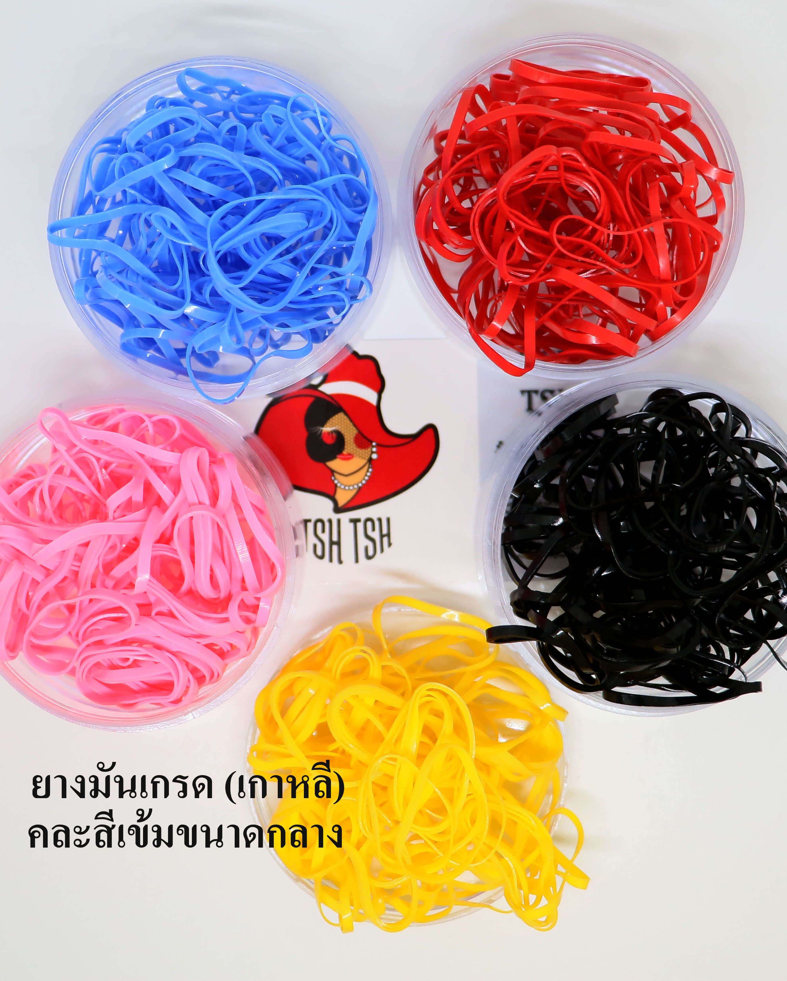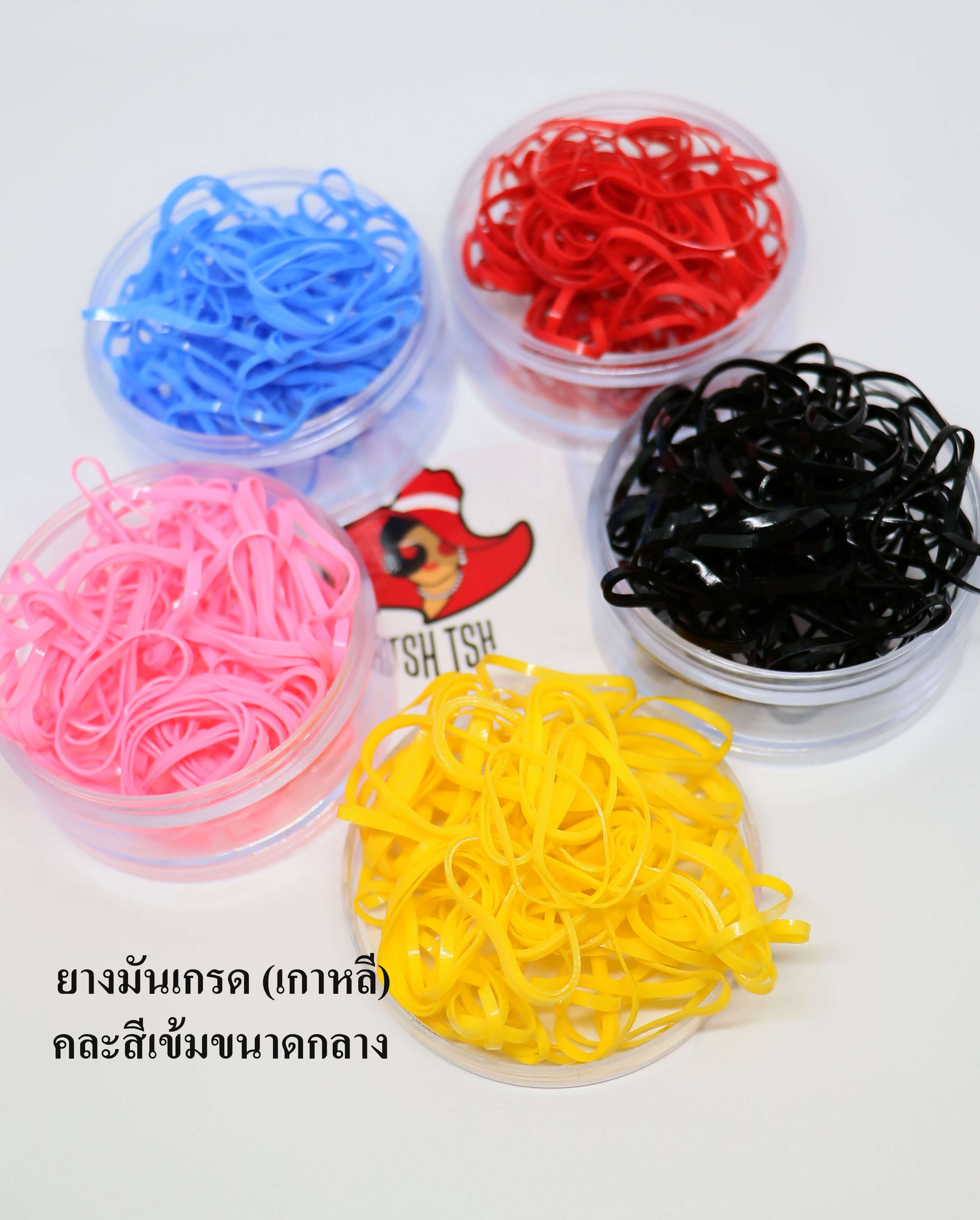 wish listยางมันคุณภาพดีเกรดพรีเมี่ยม (เกาหลี) สีเข้ม (คละสี 5 สี ใน 1 แพ็ค) เส้นขนาดกลาง (หน้ากว้างประมาณ 2 มม.) เส้นผ่าศูนย์กลางประมาณ 2.8 ซม. คุณสมบัติ เส้นเหนียว หนา มีความยีดหยุ่นสูง ยืดได้ยาวสูงสุดประมาณ 18 ซม. ขาดยาก ใช้ได้หลายครั้ง