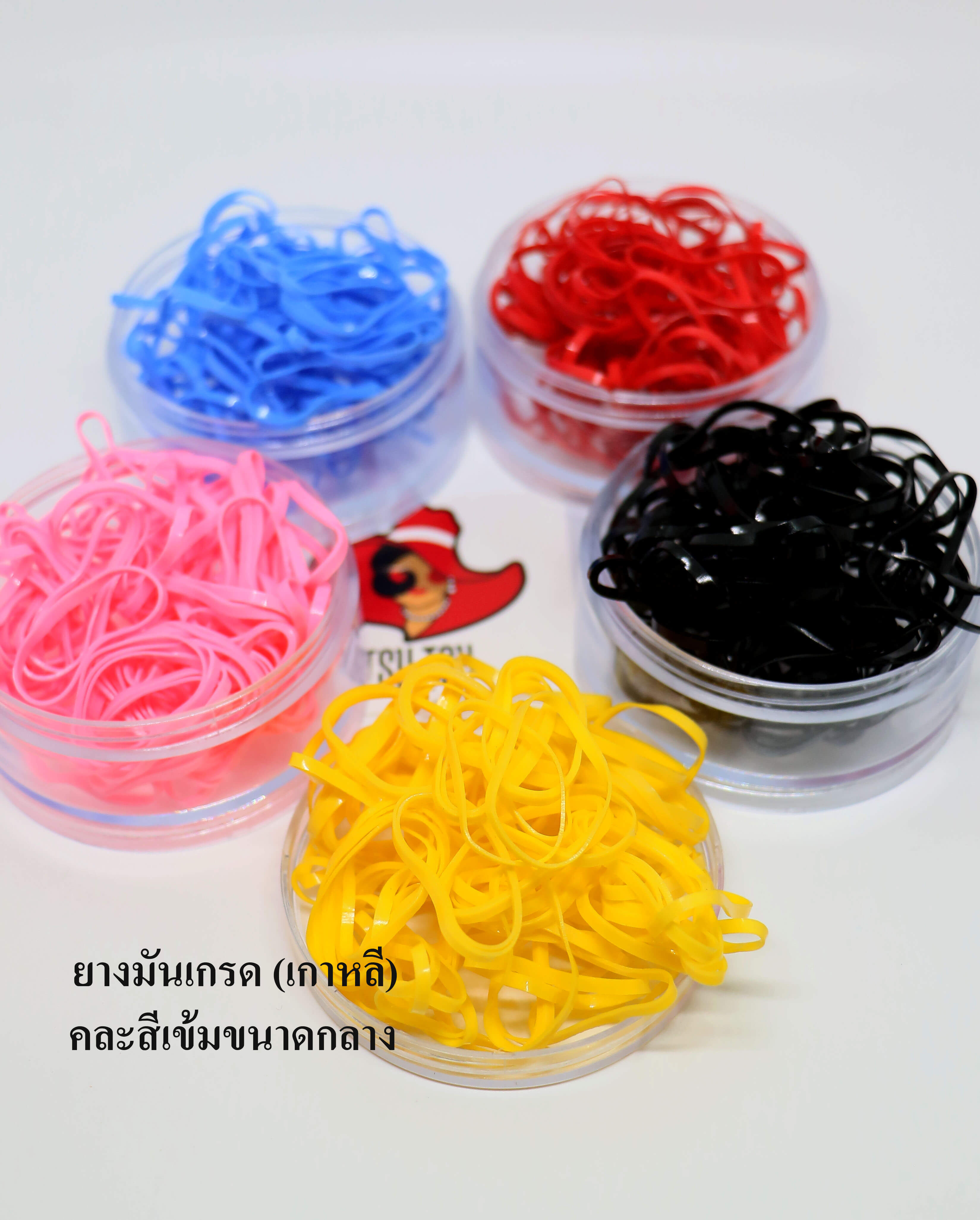 ยางมันคุณภาพดีเกรดพรีเมี่ยม (เกาหลี) สีเข้ม (คละสี 5 สี ใน 1 แพ็ค) เส้นขนาดกลาง (หน้ากว้างประมาณ 2 มม.) เส้นผ่าศูนย์กลางประมาณ 2.8 ซม. คุณสมบัติ เส้นเหนียว หนา มีความยีดหยุ่นสูง ยืดได้ยาวสูงสุดประมาณ 18 ซม. ขาดยาก ใช้ได้หลายครั้ง