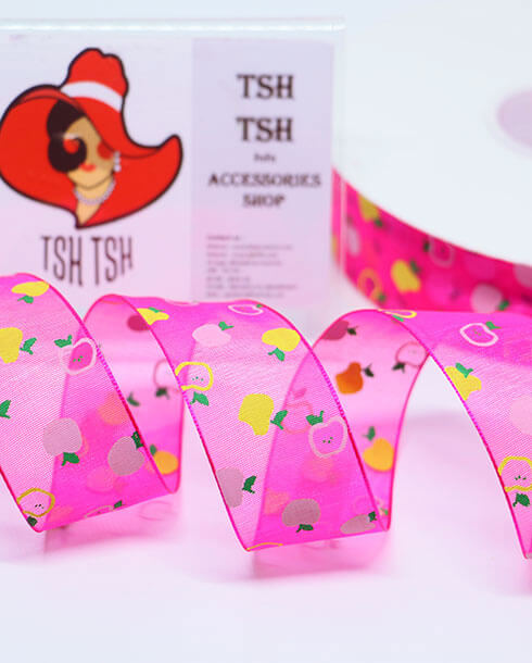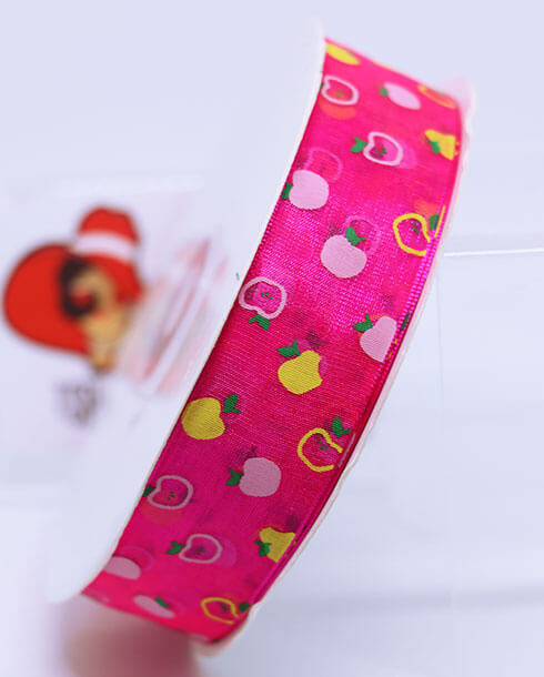 ริบบิ้นผ้าแก้ว ขนาด 1 นิ้ว สีชมพูสะท้อนพิมพ์ลายแอปเปิ้ล3สี ยาว 50 หลา #14
