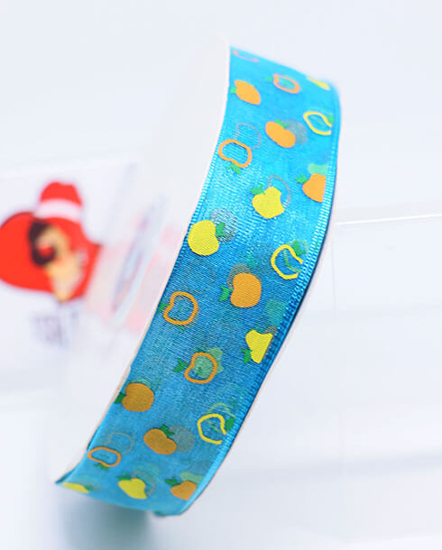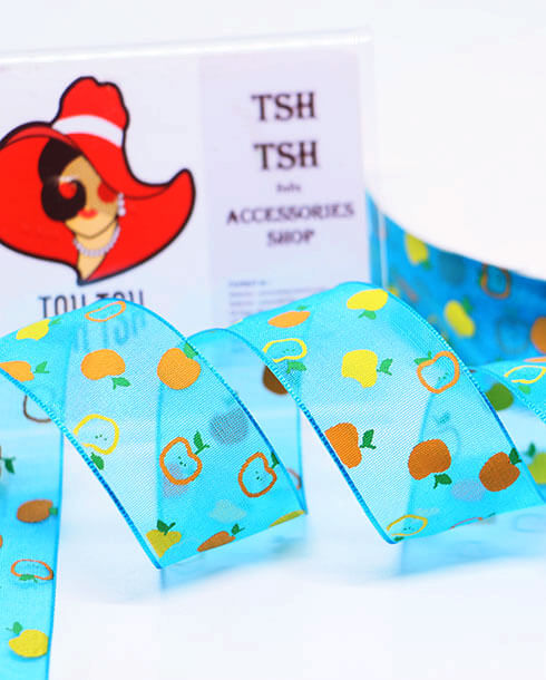 ริบบิ้นผ้าแก้ว ขนาด 1 นิ้ว สีฟ้าน้ำทะเลพิมพ์ลายแอปเปิ้ล3สี ยาว 50 หลา #47