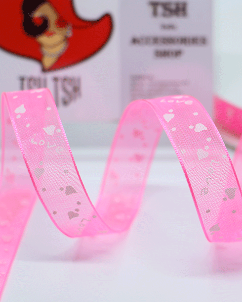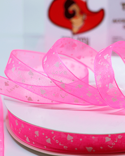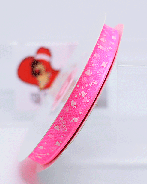 ริบบิ้นผ้าแก้ว ขนาด 13 มิล สีชมพูกลางพิมพ์ลายLoveสีขาว ยาว 50 หลา #05